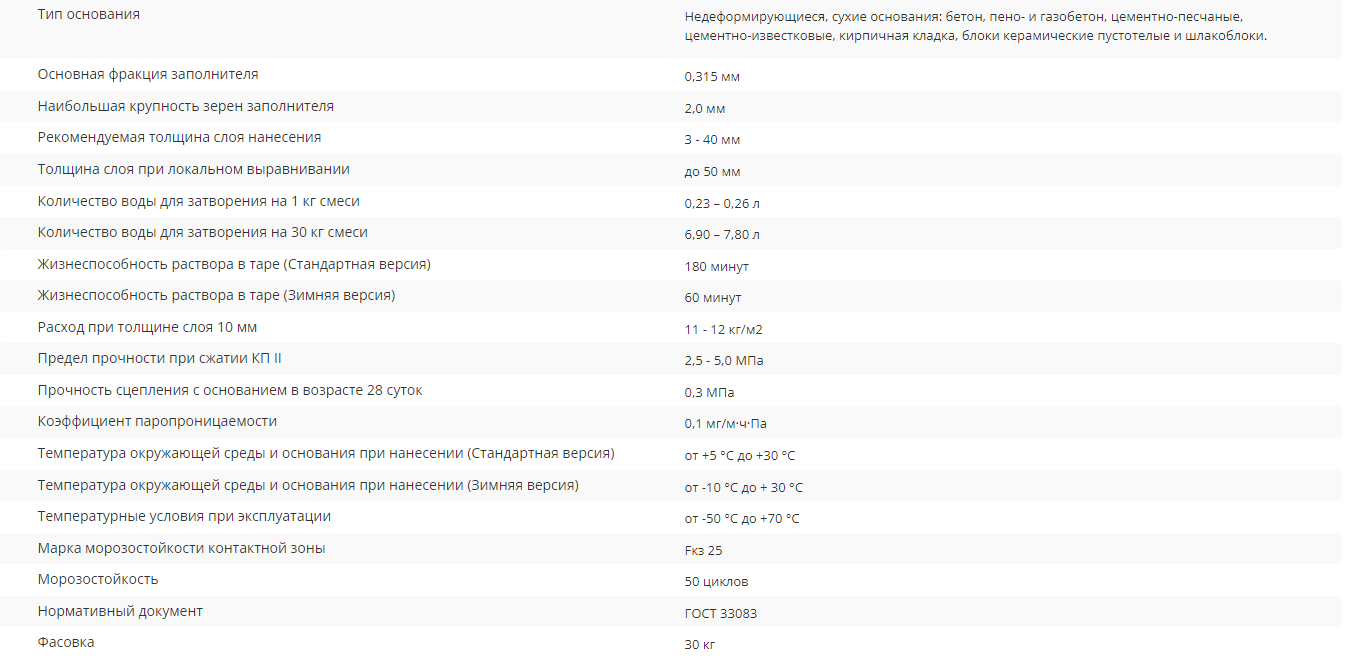 Для высококачественного выравнивания (слой 3 – 40 мм) поверхности фасадов зданий и сооружений, стен внутри всех видов помещений в т.ч. влажных и неотапливаемых: подвалы, балконы и лоджии, паркинги, лестничные пролеты, марши, склады, душевые и ванные комнаты. Может применяться для предварительного выравнивания потолков, для заделки трещин, выбоин и углублений. Используется под последующую отделку: финишное шпатлевание, отделку декоративными штукатурками, плиточную облицовку или окрашивание, а также применяется в качестве накрывочного (лицевого) слоя при устройстве комбинированных многослойных штукатурных систем. Штукатурный слой обладает высокой паропроницаемостью и адгезией к основанию, а также стойкостью к усадке. Содержит лёгкий наполнитель перлит. Для наружных и внутренних работ. Для нанесения с помощью всех видов штукатурных станций и для ручного нанесения.